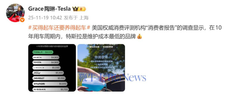 今日配资炒股免费开户,特斯拉副总裁陶琳发文称,据美国权威消费评测机构“消费者报告”的调查显示,在10年用车周期内,特斯拉是维护成本最低的品牌。