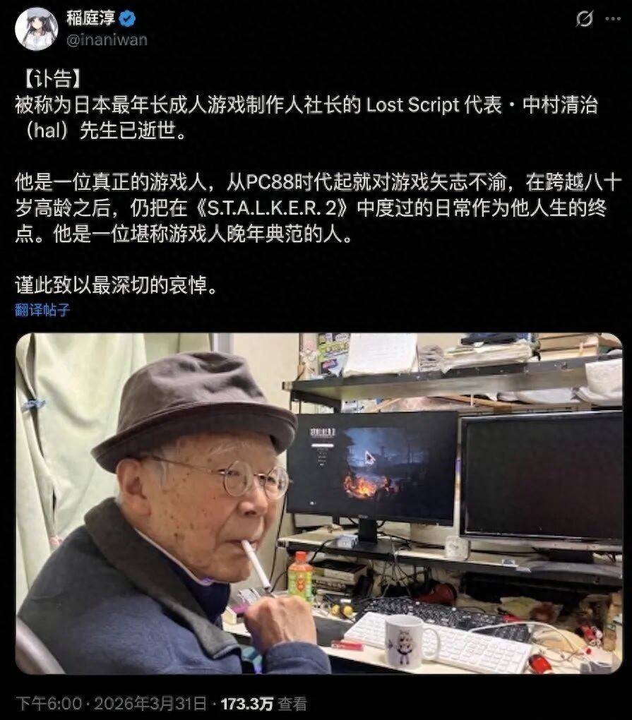 3月31日,一则讣告在游戏圈的角落静静传开:日本成人游戏品牌Lost Script的社长中村清治已逝世,享年84岁。