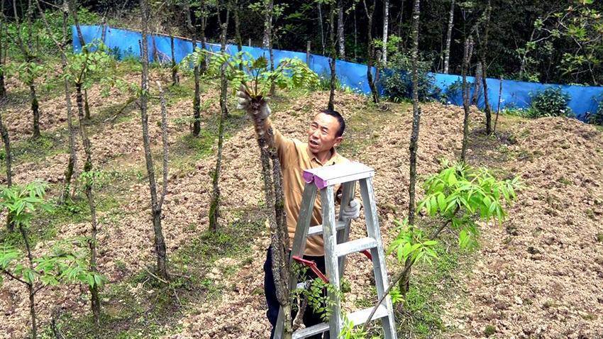4月19日,金灿灿的阳光为满坡翠绿的嫩芽镀上柔光。在鹤峰县洞长湾村的龙芽楤木树下,村民何翠国踩着夹梯,戴着厚厚的防刺手套,正手法娴熟地采下树顶一簇簇嫩芽——这便是“刺包头”。