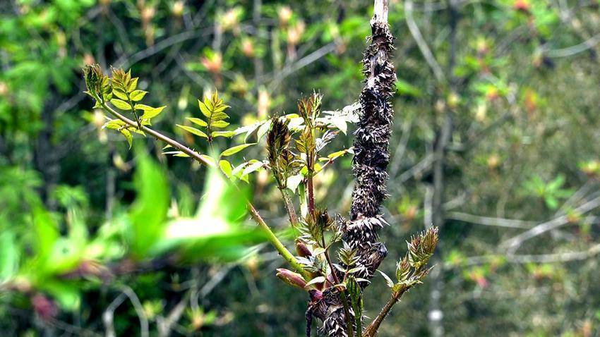 鹤峰县洞长湾村五组村民何翠国说,“今天天气很好,我们就带着孩子们一起上山。你看这个刺包头,刚刚冒出来,长着嫩叶子,嫩得很。但是摘的时候要小心,杆子上全是刺,要戴厚手套,一般选那种还没展开叶子的,最嫩最好吃。”