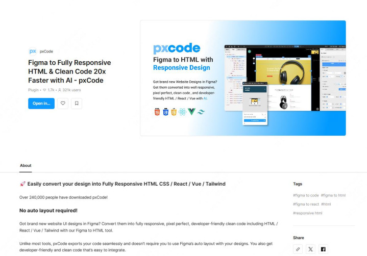 pxCode是一款在Figma社区很受欢迎的三方插件,它能够将Figma设计稿快速转化为响应式的代码。pxCode的核心理念是“Human + AI”,即结合人工智能的自动化与人类开发者的精准控制,力求在效率和代码质量之间取得最佳平衡。