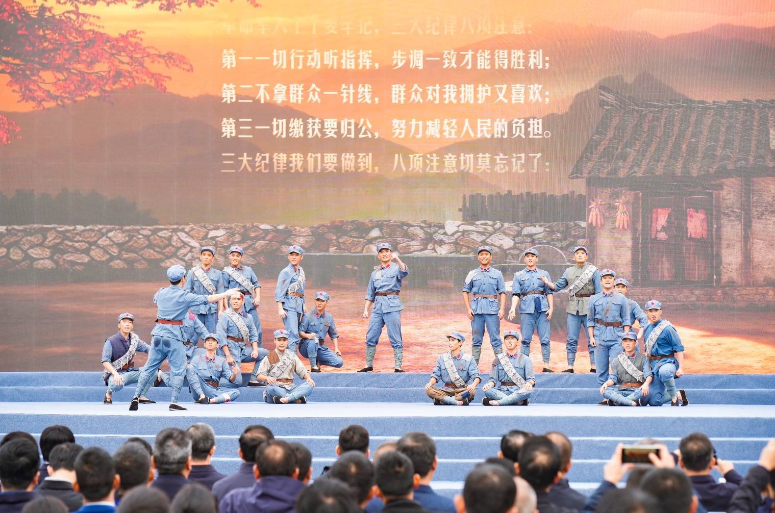 11月8日下午,在宣化店镇河西村突围广场,由武汉传媒学院师生创排的行进式红色情景剧《1946中原突围》正在首演,该剧以“实景还原、互动沉浸、专业协同”的创新表达,让70多年前的革命历史走进现实,引得数百名旅游者凝神观看。